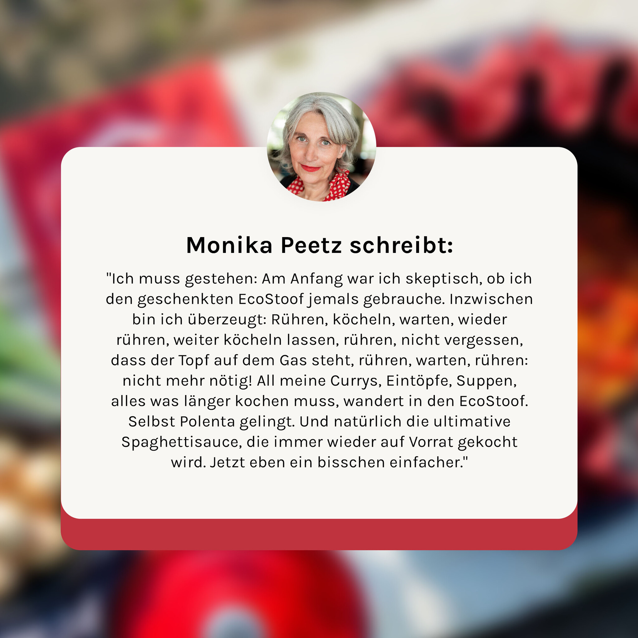 " Ich muss gestehen: am Anfang war ich skeptisch, ob ich den geschenkten Ecostoof jemals gebrauche. Inzwischen bin ich überzeugt: Rühren, köcheln, warten, wieder rühren, weiter köcheln lassen, rühren, nicht vergessen, dass der Topf auf dem Gas steht, rühren, warten, rühren: nicht mehr nötig! All meine Currys, Eintöpfe, Suppen, alles was länger kochen muss, wandert in den Ecostoof. Selbst Polenta gelingt. Und natürlich die ultimative Spaghettisauce, die immer wieder auf Vorrat gekocht wird. Jetzt eben ein bisschen einfacher."